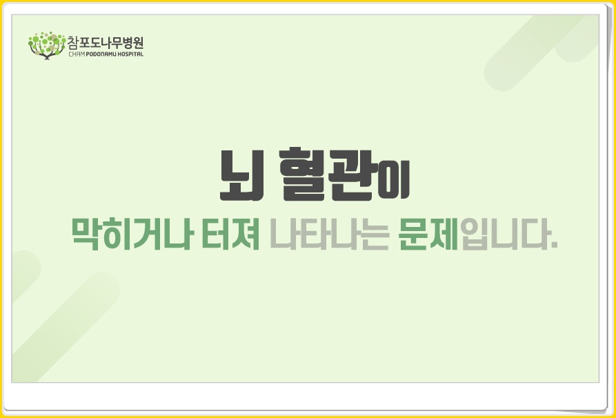 뇌혈관이 막혀 뇌에 혈류 공급이 중단되는 뇌경색, 뇌혈관 파열에 의해 혈류 공급이 중단되는 뇌출혈이죠