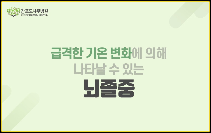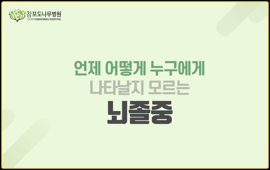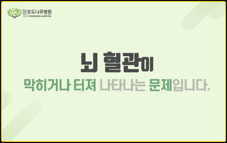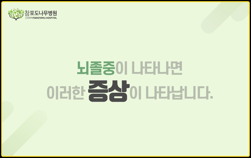 머리가 깨질 것 같은 강한 두통, 취한 듯 휘청거리는 어지럼증, 시야장애, 몸의 한 쪽 부분에 마비가 생기는 편마비, 발음이 어눌해지는 발음장애 등이 뇌졸중을 알리는 신호입니다. 해당 증상이 나타났다면 지체하지 마시고 병원에 방문하여 정확한 검사를 받으시는 것이 좋습니다. 뇌졸중의 골든타임은 3시간 이내입니다. 3시간 이내에 병원에 방문하였을 경우 사망 혹은 신체장애를 최소화 할 수 있기 때문입니다.