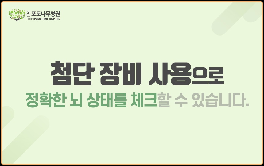 의료보험 적용으로 비용 부담이 크지 않으며 시간적 여유가 없는 분들을 위한 원데이 검진 시스템 역시 참포도나무병원에서 운영하고 있으니 참고해주시면 감사하겠습니다. 50대가 넘었음에도 불구하고 뇌검진을 한 번도 받지 않으셨나요? 가족력이나 만성질환을 가지고 계신가요? 해당 분들은 뇌졸중 발생 가능성이 매우 높으니 꼭 검진을 통해 예방에 힘쓰시기 바랍니다.